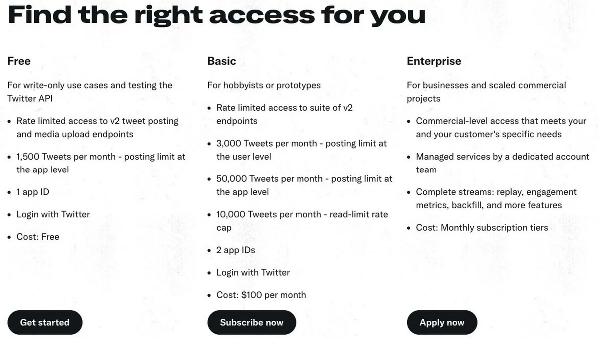 Впервые о планах взимать плату за пользование API в Twitter заговорили в феврале. Тогда в соцсети нововведение объясняли борьбой с ботами и манипуляциями. Сейчас Twitter предлагает три тарифных плана: бесплатный, основной за $100 в месяц и корпоративный, цена за который не указана.