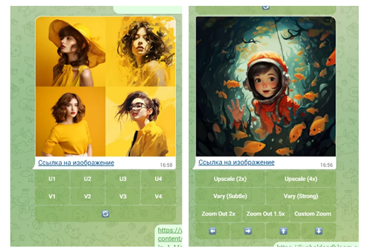 Пользователи могут обновить понравившиеся им черновые изображения до более высокого качества или создать вариации одним щелчком мыши. Режим можно активировать с помощью команды параметра «—draft», хотя он работает только с v7.