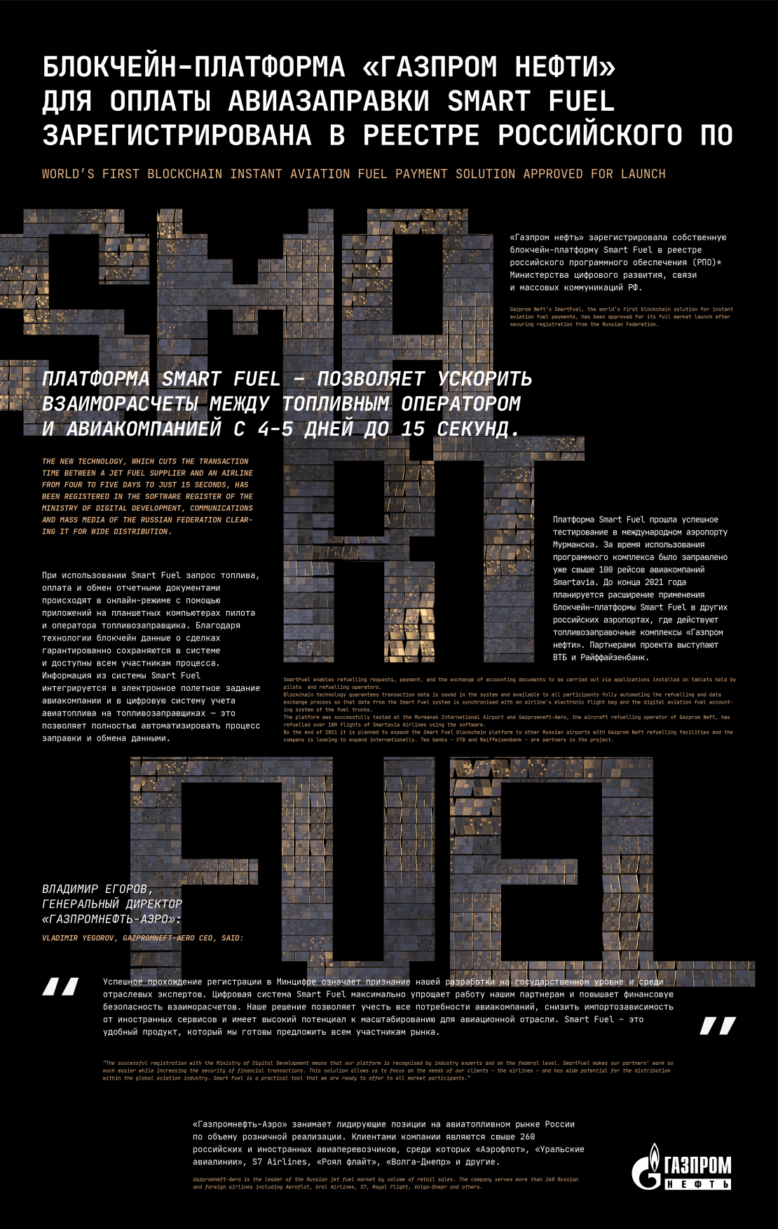 Пресс-релиз посвящен блокчейн-технологии, которая значительно упрощает процесс оплаты авиазаправки — Smart Fuel. Разработка позволяет сократить время взаиморасчёта с 4–5 дней до 15 секунд.