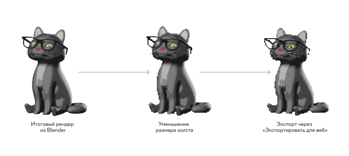 Сначала кот был санимирован в родной среде Blender и перенесён в виде набора png-изображений Adobe Photoshop. Здесь уменьшили размер холста, чтобы создать эффект пикселизации. Сохранили через функцию «Экспортировать для веб», где в настройках уменьшили количество цветов, увеличили эффект дизеринга, чтобы создать ощущение нехватки цвета и добавить олдскульности переходу между изображениями.