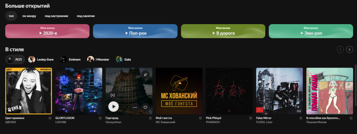 Еще ниже «Больше открытий» и «В стиле». К первому блоку вопросов нет — мы выбираем категорию, нажимаем на понравившейся стиль и слушаем песни.