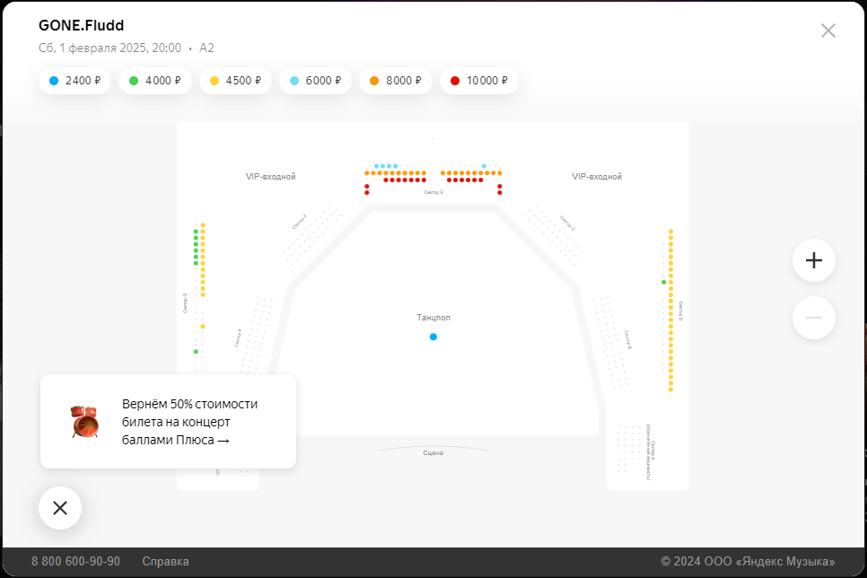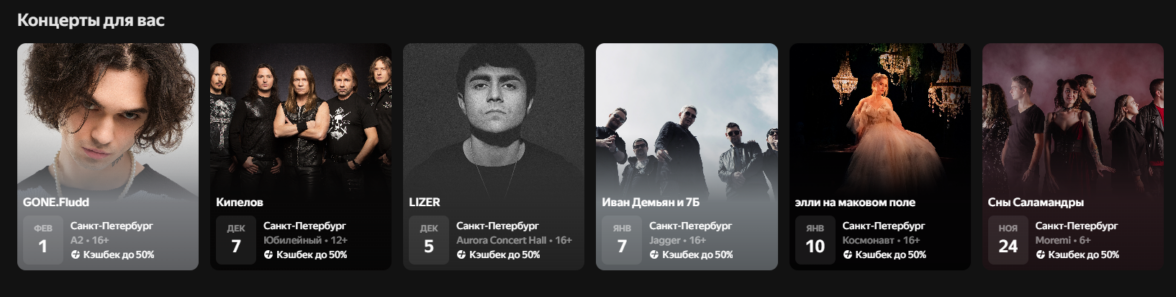 Если кто не знает, то у Яндекса есть отдельный сервис для таких вещей и называется он «Афиша». И ладно бы пользователи при клике на карточки переходили на артиста и могли послушать их треки. Так нет, нас сразу переводят на «зал» и предлагают купить билеты:
