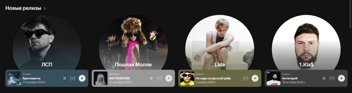 Третий блок на главной — Новые релизы. Они сопровождаются огромной аватаркой исполнителя и мелкой плашкой самой композиции. И тут у пользователей начинается игра «пойми куда кликать»: