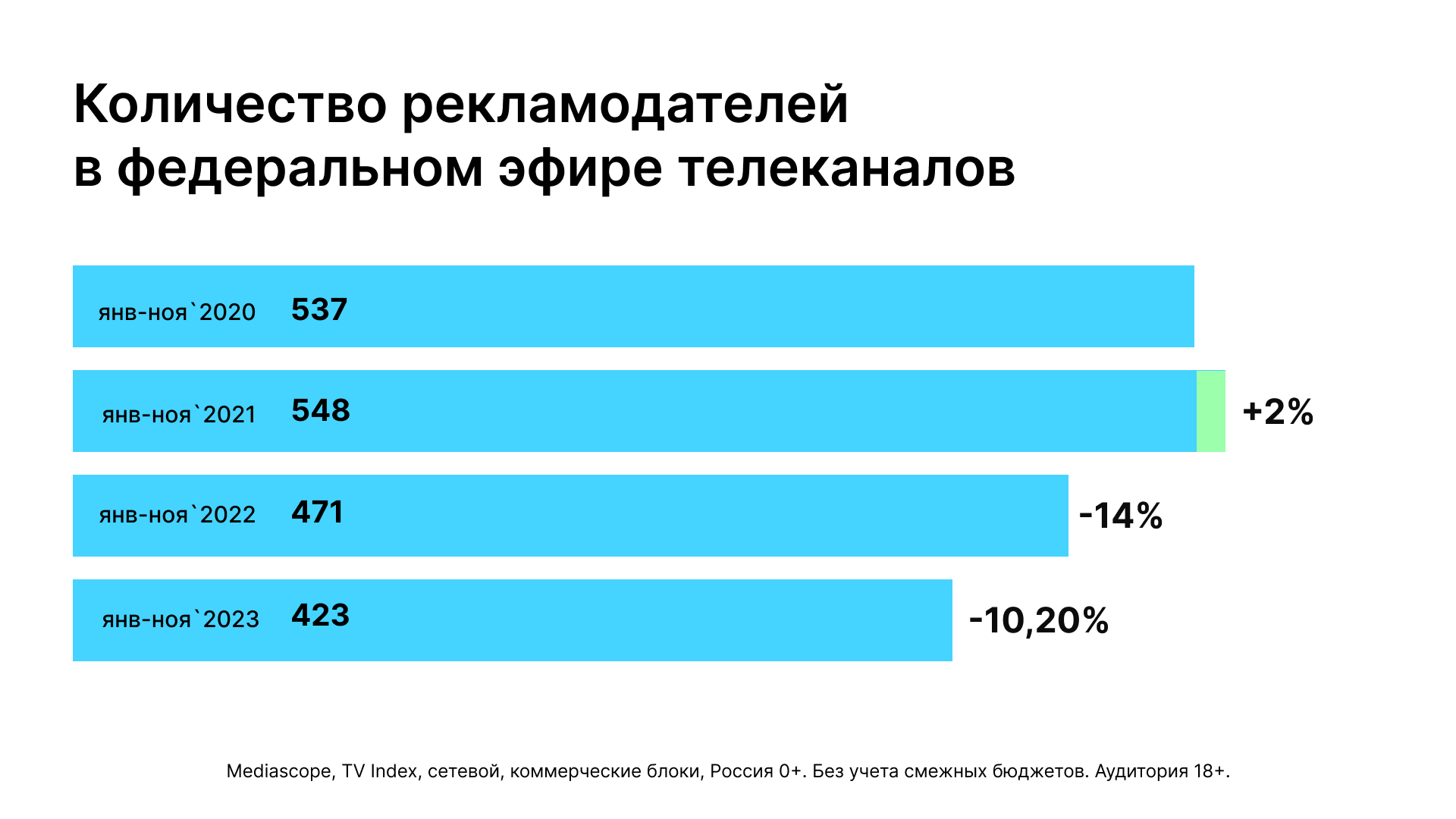 Если объем рекламы на федеральном ТВ рос, то количество рекламодателей уменьшалось. В январе-ноябре 2023-го сокращение составило 10,2%: до 423 компаний по сравнению с аналогичным периодом прошлого года, подсчитали в Tersus. Темпы падения немного замедлились: в январе-ноябре 2022-го рекламодателей стало меньше на 14% — 471 компания. Максимальное с начала пандемии количество рекламодателей разместилось в телеэфире в январе-ноябре 2021 года — 548.