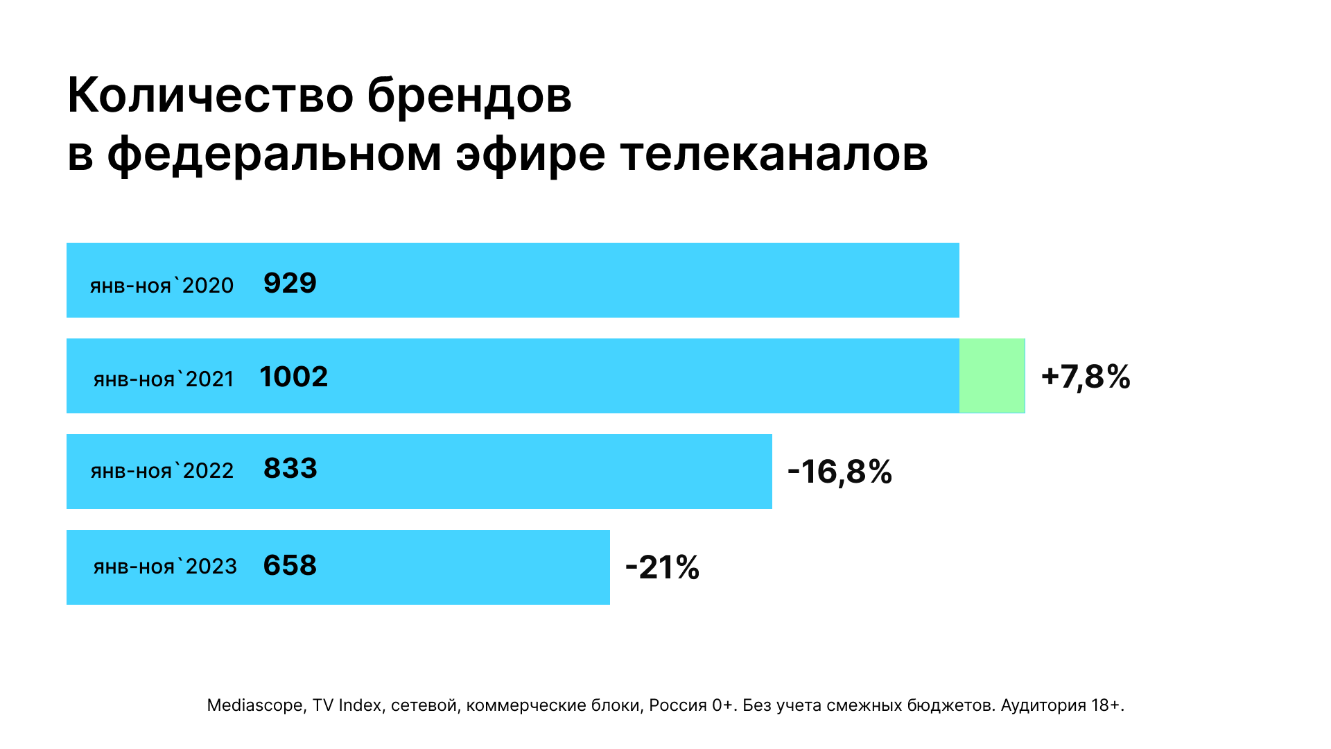 Количество брендов, рекламирующихся на федеральном ТВ, также снижается второй год подряд. В январе-ноябре 2023-го оно упало на 21%, до 658 штук. Год назад мониторинг Mediascope зафиксировал 833 бренда, в 2021 — 1002.