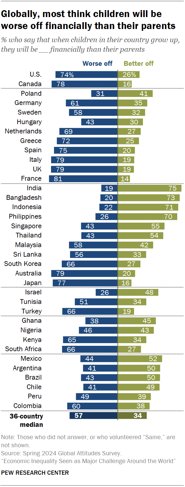 Самый высокий процент тех, кто считает, что дети будут беднее родителей — 81% — во Франции. В Австралии, Великобритании, Италии такой точки зрения придерживаются 79% опрошенных. В Канаде — 78%. В Японии — 77%. В США — 74%. Самый маленький показатель в Израиле — 26%.