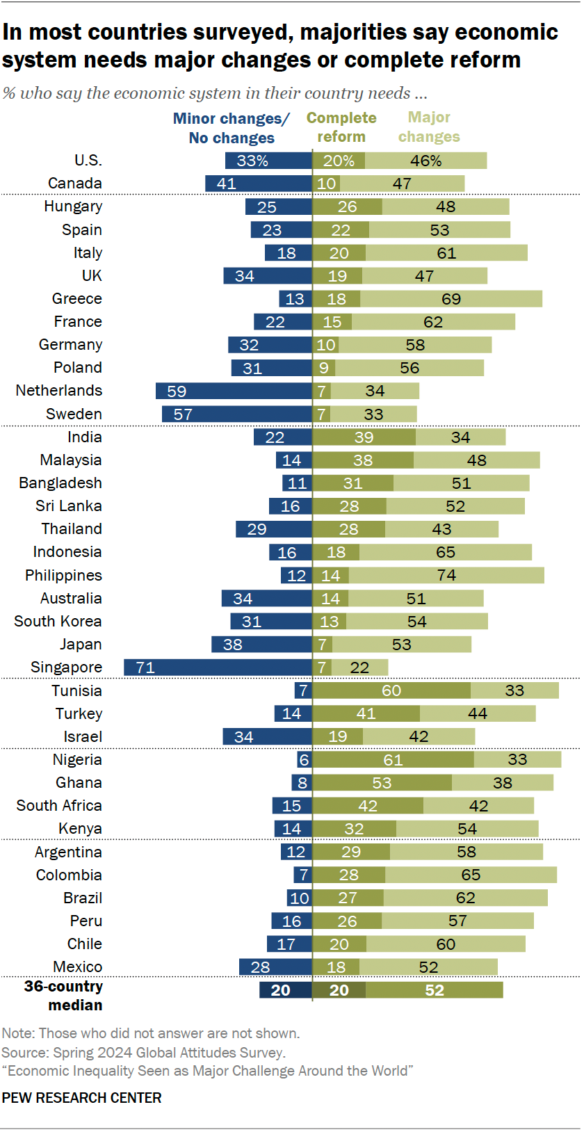 В 33 из 36 стран большинство опрошенных высказалось за то, что для исправления ситуации с социально-экономическим неравенством нужно реформировать или полностью менять всю экономическую систему.