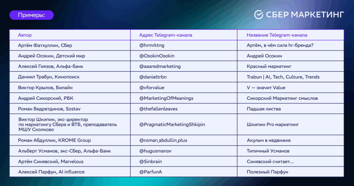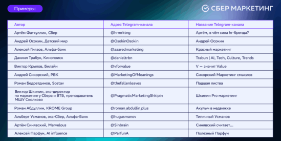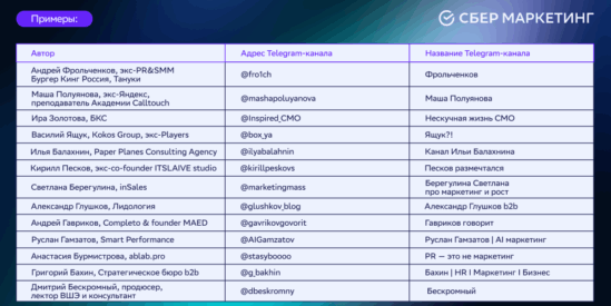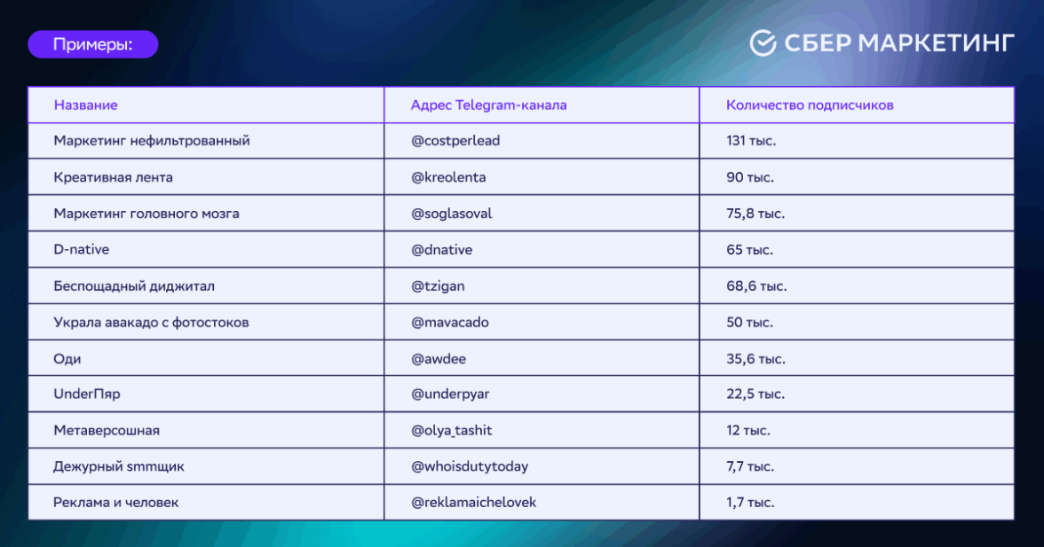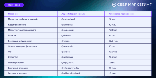 Если вы хотите, чтобы ваш Telegram-канал мы добавили в списки выше, напишите нам на почту pr@sbermarketing.ru