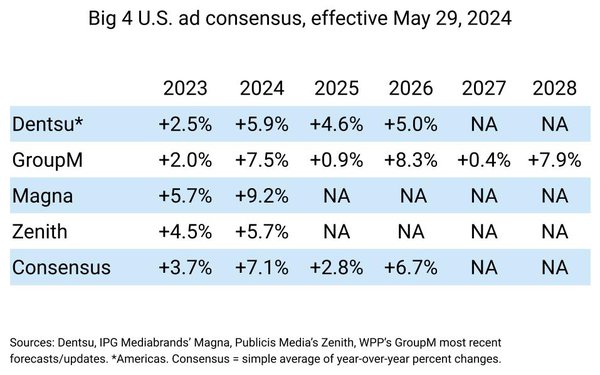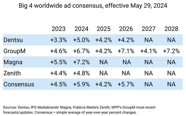 Самые низкие прогнозы по росту мирового рекламного рынка в этом году — у Zenith (+4,8%) и у Dentsu (+5%), которые традиционно более осторожны в своих предсказаниях. Dentsu опубликовала свой обновленный прогноз вчера, 29 мая, и улучшила предыдущие расчеты по росту глобального рынка на 0,4 п.п. По предыдущему прогнозу японской группы, вышедшему в конце 2023 года, рост рынка был еще ниже, чем у Zenith — 4,6%.