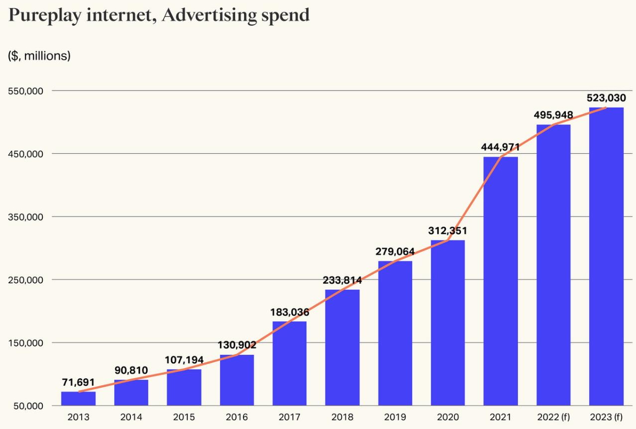 Согласно оценке WARC, в 2022-2023 годах темп роста мирового рекламного рынка замедлится, его объем в 2023 году составит $880,9 млрд. Основные потери понесут сегменты ТВ-рекламы и рекламы в прессе. Расходы рекламодателей на продвижение в интернете (поиск и соцсети) все же вырастут, но не так бурно, как в 2021 году, когда после пандемии мировые затраты на цифровую рекламу увеличились сразу на 42% год к году. В 2022 году рост составил 11,5%, а в этом году прогнозируется на уровне около 5,5%. Но общая сумма ожидаемых затрат на интернет-рекламу в 2023 году выглядит внушительно — $523 млрд.