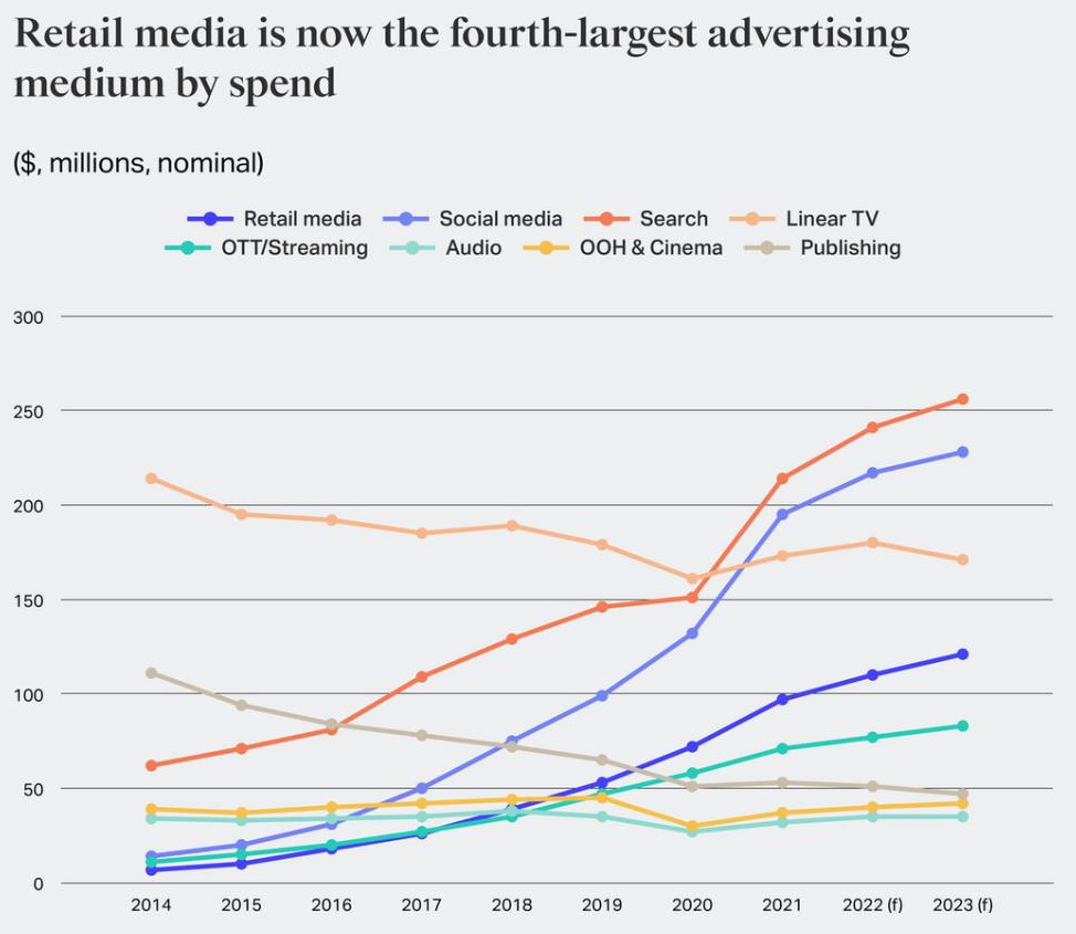 Большая часть инвестиций в интернете будет потрачена на продвижение в интернет-поиске. Немного меньше заработают социальные сети. Третье место среди всех медиаканалов занимает телереклама, но в 2023 году ей прогнозируют падение. Четвертое место по выручке от рекламы — у ритейл-медиа, рекламные инвестиции в которые в 2022 году оцениваются в $110,7 млрд, а в 2023 году достигнут $121,9 млрд. По оценке экспертов WARC, в 2025 году ритейл-медиа обгонят телевидение по рекламным доходам.