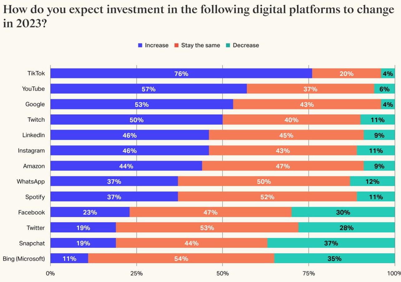 TikTok стал самой популярной платформой для рекламодателей в соцсетях. Согласно недавней оценке WARC, доход от рекламы платформы увеличится в 2023 году на 53% и достигнет впечатляющих $15,2 млрд. Этот прогноз полностью подтверждается настроем опрошенных компанией маркетологов. 76% из них заявили, что в этом году планируют увеличить рекламные бюджеты, выделяемые на продвижение в китайской соцсети, 20% респондентов предпочли оставить затраты на TikTok на уровне прошлогодних и лишь 4% планируют сокращение рекламных инвестиций в эту платформу.