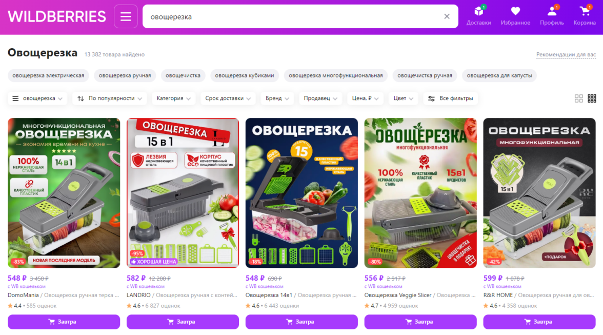 В категории уже есть большие игроки, с хорошими рейтингами, с отзывами, с наработанным объёмом продаж. Эти игроки по умолчанию всегда выше в выдаче, и на рекламу у них деньги есть. Кроме того, в нише идёт борьба за 10–15 рублей чистой прибыли, потому что овощерезки стоят в опте примерно одинаково. Стоимость доставки из Китая не ниже определённого порога, и с маржинальностью особенно не поиграешь.