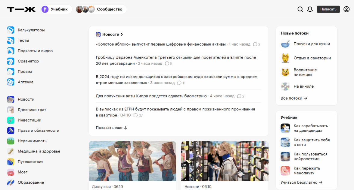 Одна из главных особенностей Т—Ж — тематические потоки и пользовательские сообщества, в которые можно перейти с главной страницы сайта