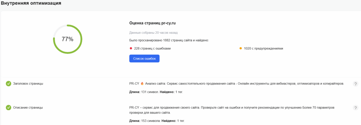Интерфейс инструмента для анализа сайта: внутренняя оптимизация