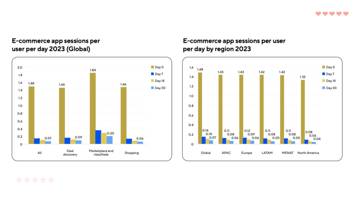 В 2023 году глобальная медиана для всех приложений составила 1,48 сессии на день 0, тогда как для шопинг-приложений и приложений для поиска предложений она была 1,45 и 1,46 соответственно.