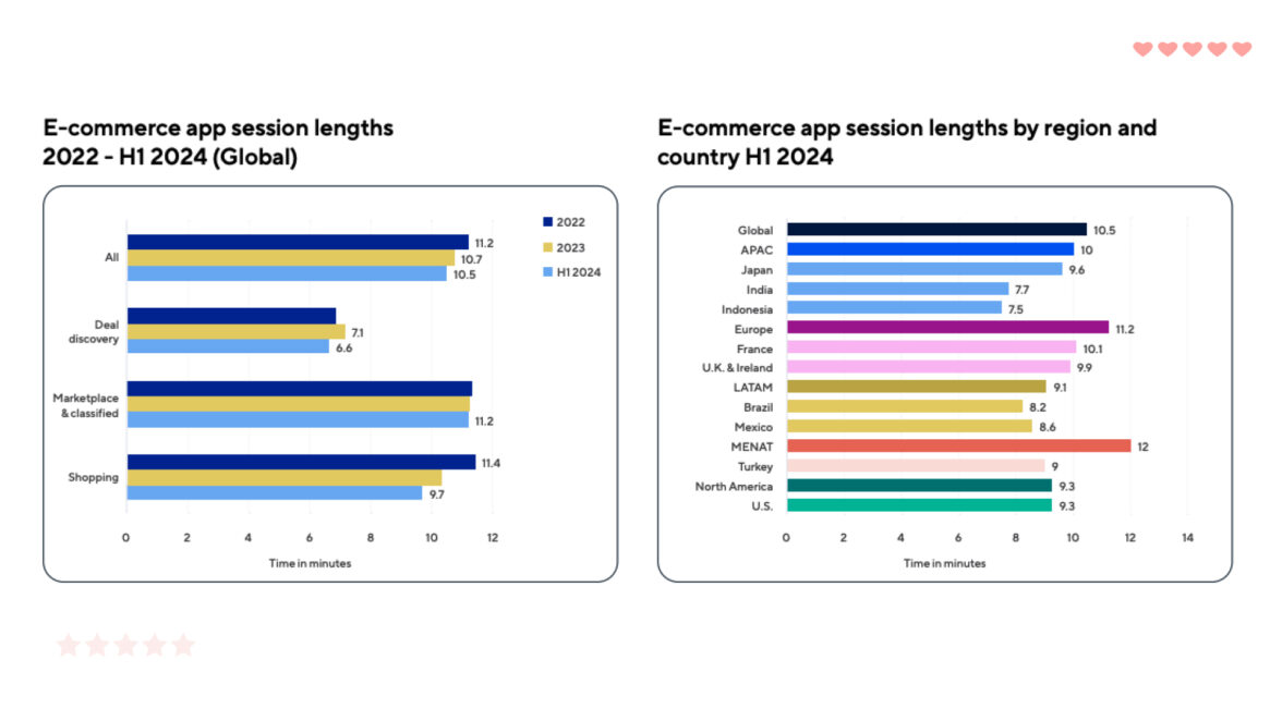 В глобальном масштабе, как показывают данные, продолжительность сессий в приложениях электронной коммерции снизилась на 6% с 2022 года до первой половины 2024 года. Среднее время сессии, в свою очередь, упало с 11,2 минуты до 10,5.