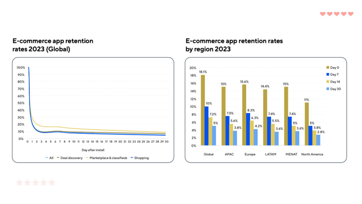 В 2023 году приложения электронной коммерции демонстрировали уровень удержания 18% на день 1, который, к сожалению, упал до 5% к 30-му дню.