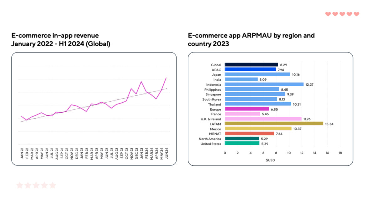 Что касается среднего дохода на одного активного пользователя в месяц для приложений электронной коммерции, то он составил $8,29.