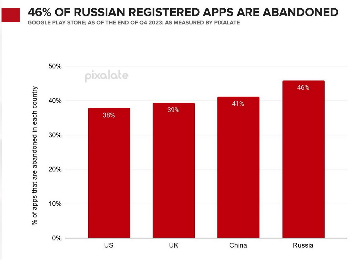38% мобильных приложений, загруженных в Google Play, и 32% – в App Store оказались не нужны их авторам, сообщила платформа мобильной рекламы Pixalate. Среди них выделяются программы, которые не обновлялись более 4 лет: у Google таких приложений 16%, у Apple – 13%. Чаще всего свои программы бросают российские разработчики: 46% брошенных приложений для Android и 39% – для iOS зарегистрированы в России. При этом реклама в мобильных заброшках приносит забывчивым авторам $5,3 млн ежемесячно.