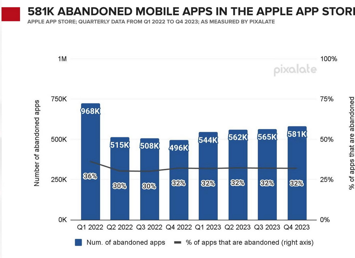 В App Store брошенных приложений меньше, чем в магазине Google. Это объясняется размерами маркетплейсов: по данным на конец 2024 года в App Store насчитывалось 1,83 млн мобильных программ, а в Play Market – 2,43 млн. По подсчетам Pixalate, в IV квартале количество не обновляемых более двух лет приложений в маркетплейсе Apple составило 581 тыс. штук (17% от общего числа программ), а 229 тыс. (13%) были заброшены авторами более четырех лет назад. Но в отличие от Google Play, где количество забытых девелоперами приложений падает, в маркетплейсе Apple их число за год выросло на 17%.