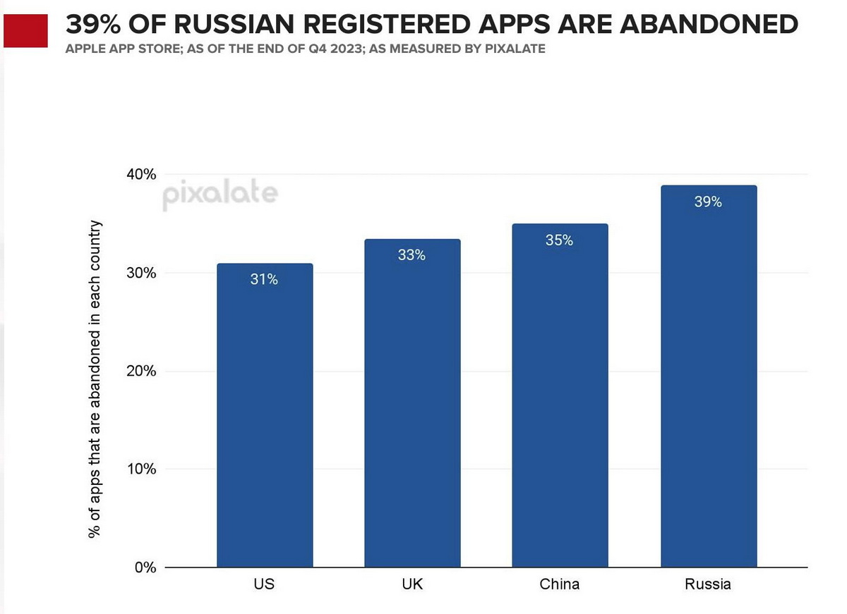 Как и в случае с Google Play в страновом рейтинге забытых авторами приложений лидирует Россия: 39% русских приложений в App Store больше не интересуют их авторов. Так же поступили 35% китайских разработчиков, 33% английских и 31% американских.