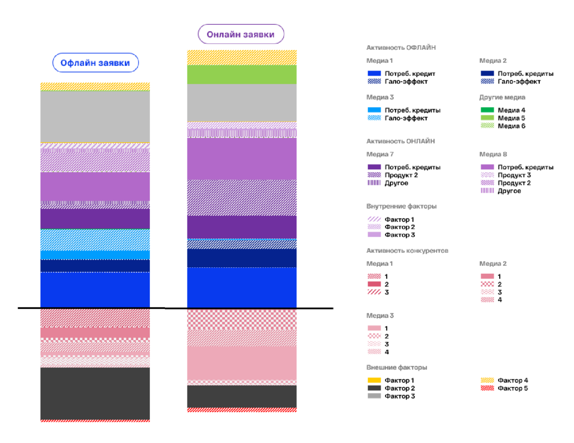 В качестве продукта был выбран потребительский кредит — одно из ключевых направлений банка. В ходе обсуждения с клиентом пришли к тому, что нужен не один KPI, а два — отдельно онлайн-заявки и офлайн-заявки. Влияние медиа и других факторов различно для онлайн и офлайн-заявок, заметны отличия в паттернах поведения пользователей. Дополнительно очистили заявки от посторонних источников, повысив валидность и точность данных.
