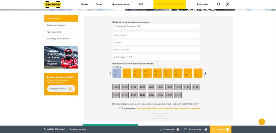 • Доработали шапку сайта под нужды клиента и особенности его бизнеса: разместили адреса магазинов и выделили пункт меню «Запись на шиномонтаж».