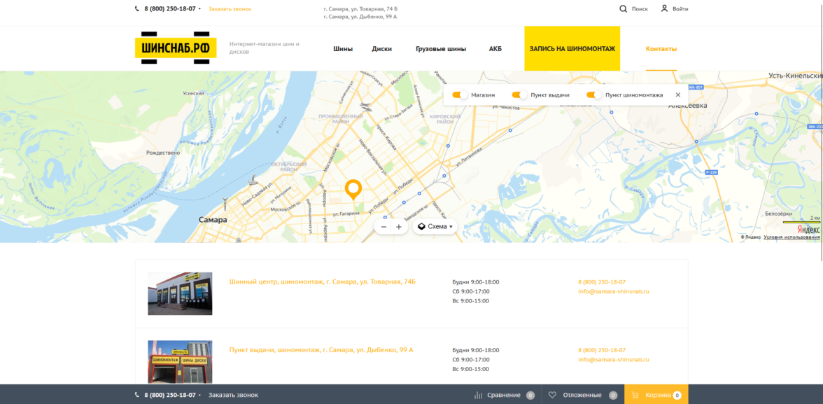 • Переработали страницу «Контакты». В стандартном решении есть две близкие по назначению страницы: «Контакты» и «Магазины». При этом на странице «Магазины» сделан чудесный функционал фильтрации точек продаж по предоставляемым в них услугам: шиномонтаж, хранение шин, выдача товаров. А на странице «Контакты» размещена только текстовая контактная информация и форма обратной связи. Мы решили объединить эти две страницы и использовать получившуюся комбинацию на странице «Контакты». Это решение будет особенно полезно по мере добавления новых магазинов и пунктов выдачи, открытие которых запланировано на ближайшее время.