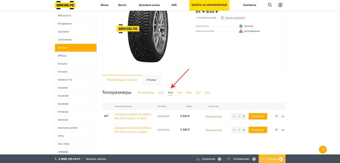 Страница раздела «Шины» с подкатегориями (брендами) →
