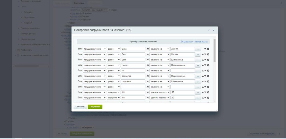 Далее мы совместили выборку по группам номенклатуры таким образом, чтобы в выгрузку, например, по шинам попали товары находящиеся в папках и «Легковые зимние шины», и «Легковые летние шины». И все они импортируются в одну категорию «Шины» на сайте.