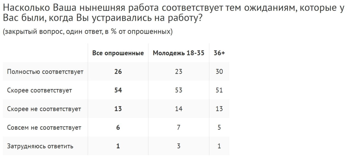 Большинство россиян считают, что их текущая работа соответствует ожиданиям при найме (80% в сумме), при этом среди молодежи 18–35 лет чуть ниже доля полностью удовлетворенных (23% против 30% среди 36+)