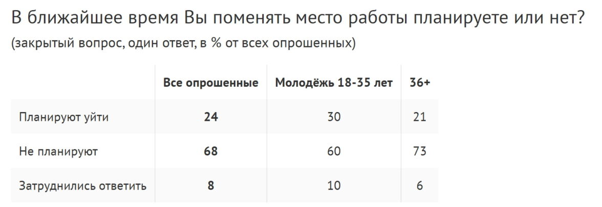 Планы смены работы среди россиян различаются по возрастным группам: молодежь (18–35 лет) чаще заявляет о намерении уйти (30%) по сравнению с сотрудниками старше 36 лет (21%), тогда как последние чаще не планируют менять работу (73% против 60%).