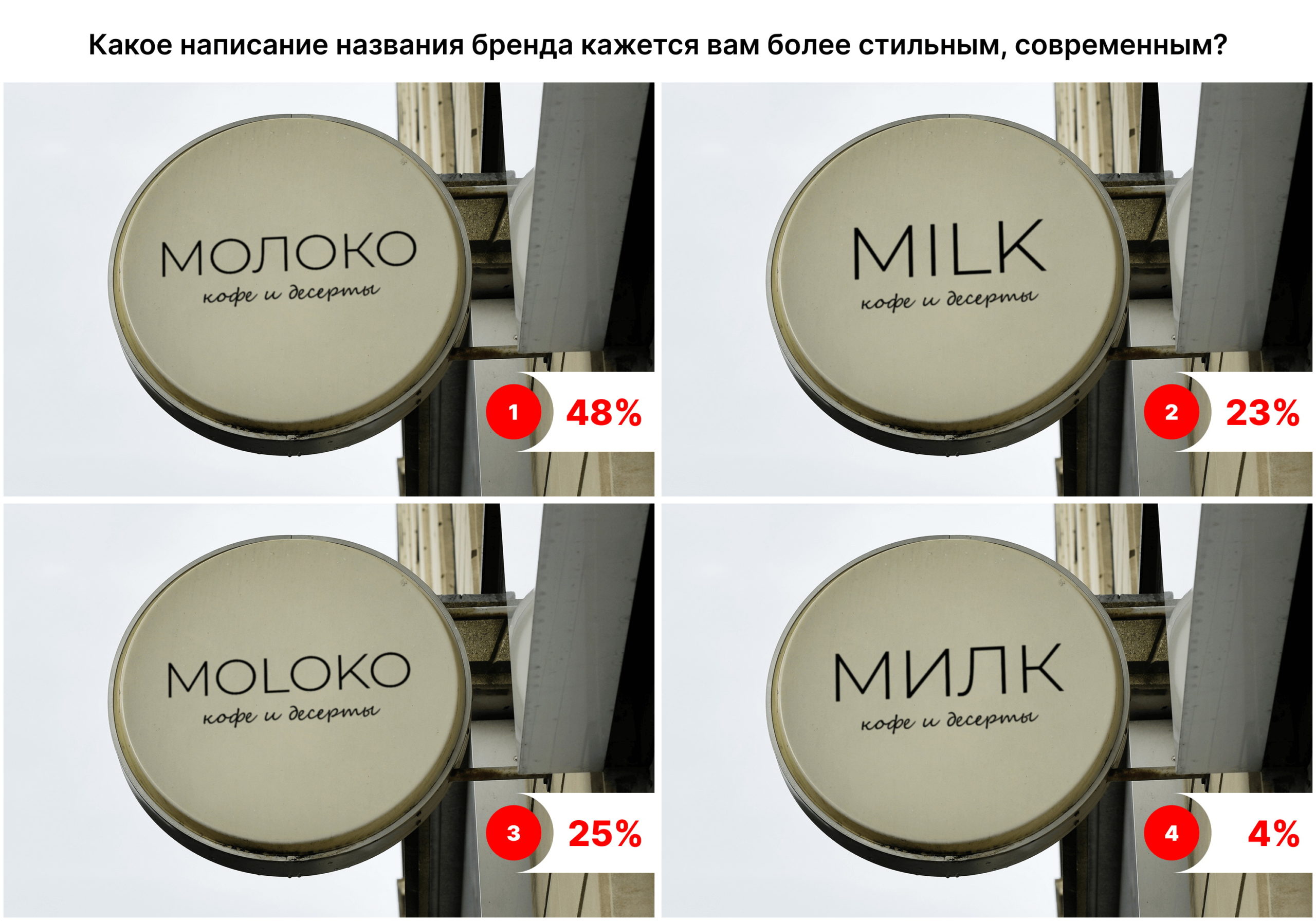 Участником исследования было предложено сравнить четыре изображения, на которых была изображена вывеска некоего гипотетического заведения. Респондентам были показаны четыре варианта написания слова «молоко»: русскоязычный вариант «МОЛОКО», англоязычный «MILK», русское слово на латинице MOLOKO и английское на кириллице МИЛК. Опрошенных спросили о наиболее предпочтительном варианте написания, какое из предложений побуждает их к покупке и воспринимается более стильным и современным.