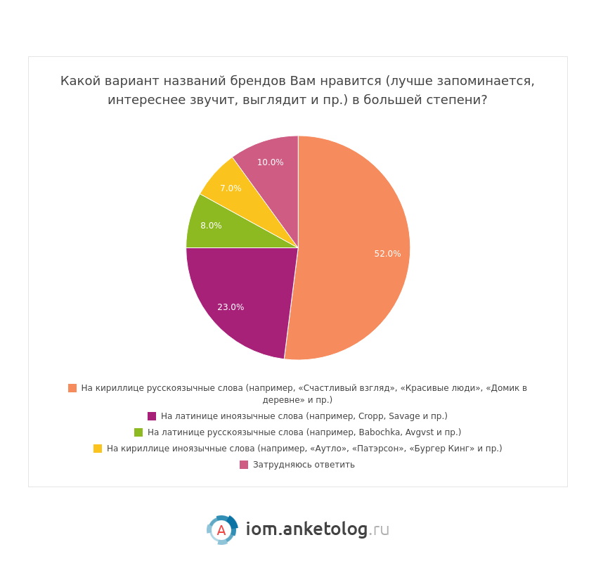 Предпочтения в вариантах написания бренд-нейма разделились следующим образом: 52% опрошенных нравятся названия на русском языке, 23% — иноязычные. Смешанный стиль, когда русские слова пишутся латинскими буквами или наоборот (Babochka или «Бургер Кинг») 8% и 7% соответственно.