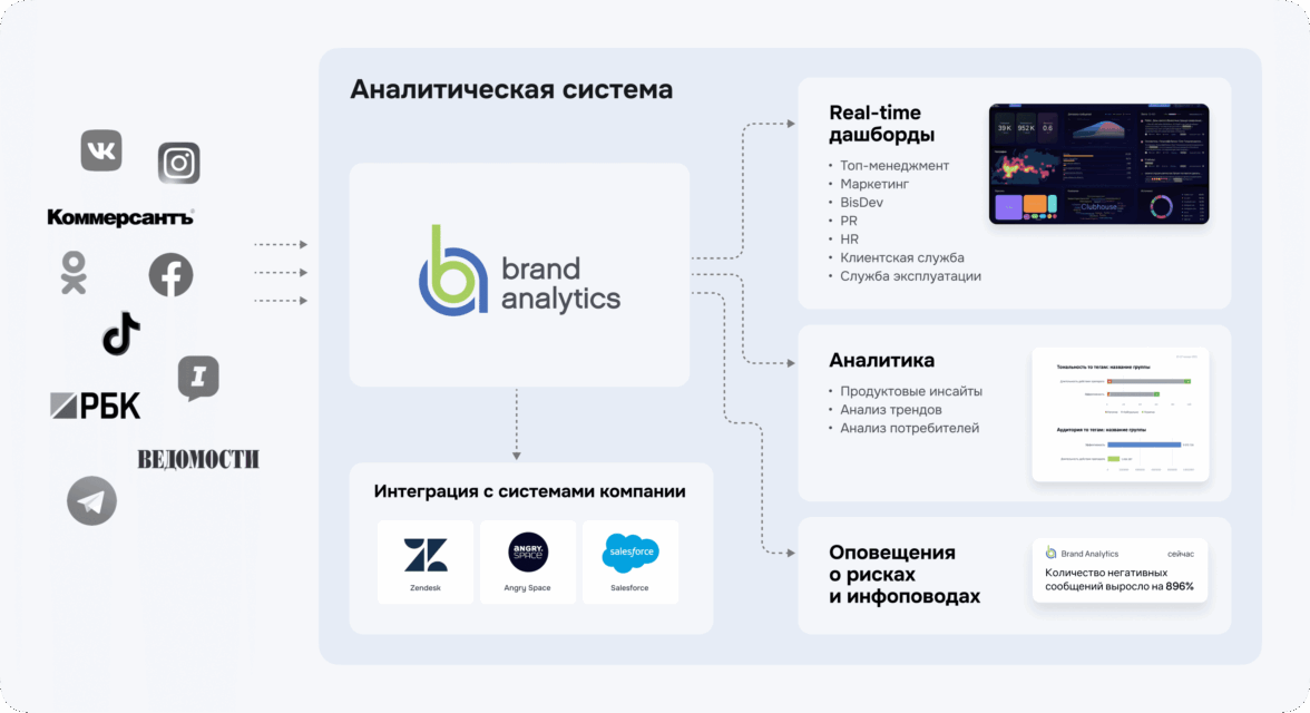• Реал-тайм дашборды — чтобы в режиме реального времени визуализировать то, как представлен бренд в публичном поле;