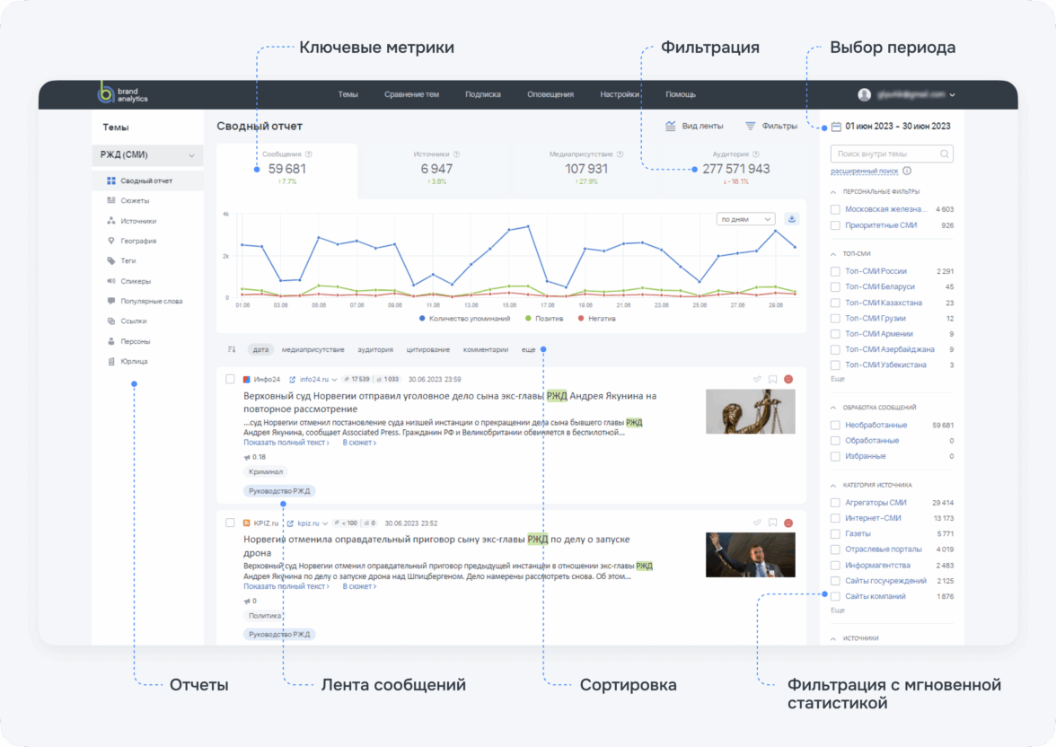 Сообщения в системе Brand Analytics благодаря использованию искусственного интеллекта и нейросетей размечаются автоматически — по тональности упоминания, тематикам, роли объекта (главная или второстепенная) и так далее. Затем в системе можно сформировать отчёты — как для быстрого анализа присутствия в СМИ, так и для анализа по срезам источников упоминаний, сюжетам, персонам, географии, популярным словам и многому другому.