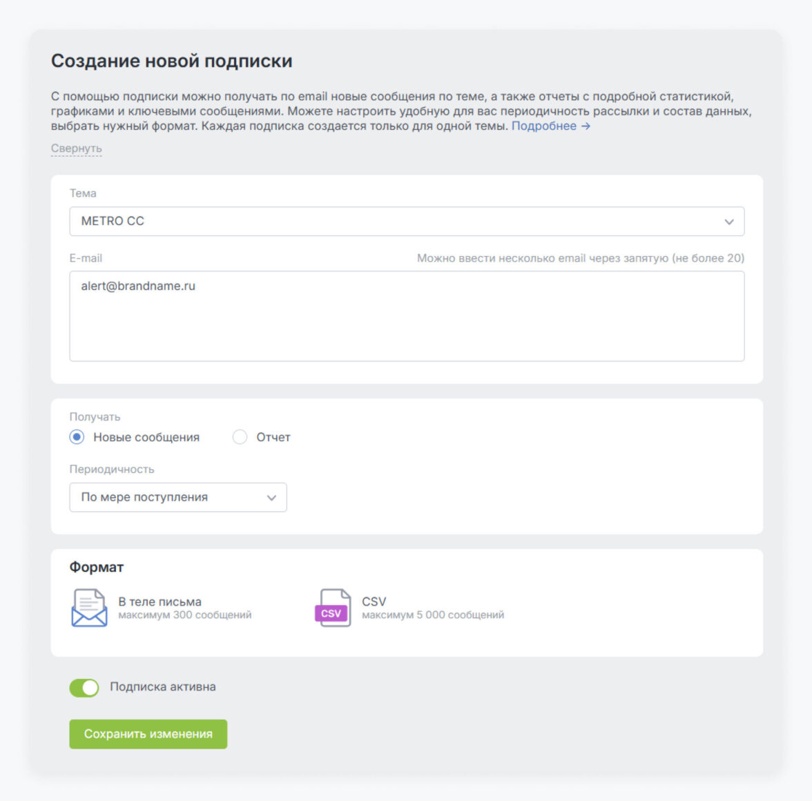 • охват источников — чтобы в мониторинг попадали все каналы, где появляются сообщения о бренде — как федеральные, так и региональные издания, отраслевые медиа, агрегаторы;