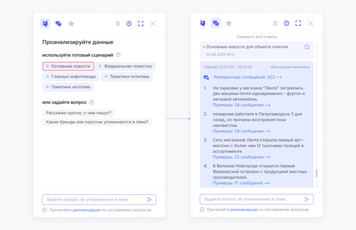 Пример: сценарий «Основные новости» для объекта «лента» → BrandGPT самостоятельно добавляет фильтры к выбранному периоду, анализирует все упоминания, выделяет ключевые тренды, генерирует текстовый вывод в виде кратких тезисов и подкрепляет их конкретными публикациями.