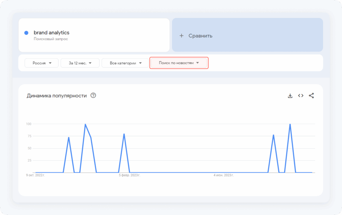 Общие тенденции популярности бренда поможет отследить сервис Google Trends. Чтобы вывести на график динамику сообщений в медиа, можно выбрать категорию «Поиск по новостям».