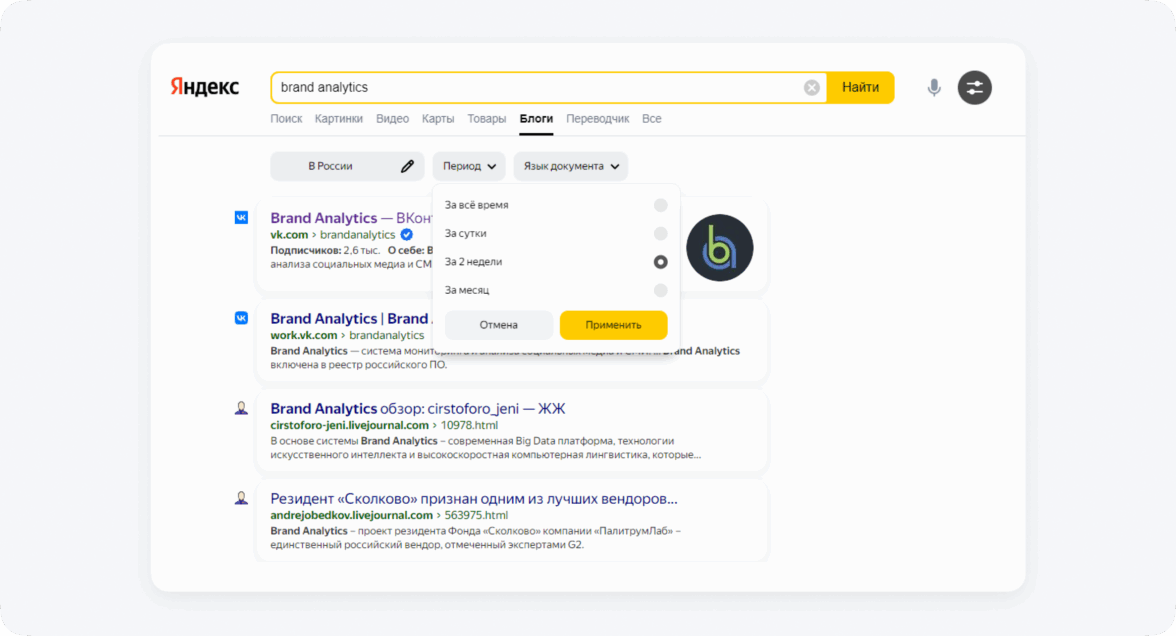 Также можно искать упоминания бренда на различных блог-площадках — в Яндексе. Для этого в поисковике есть поиск по блогам. Для удобства стоит указать период.