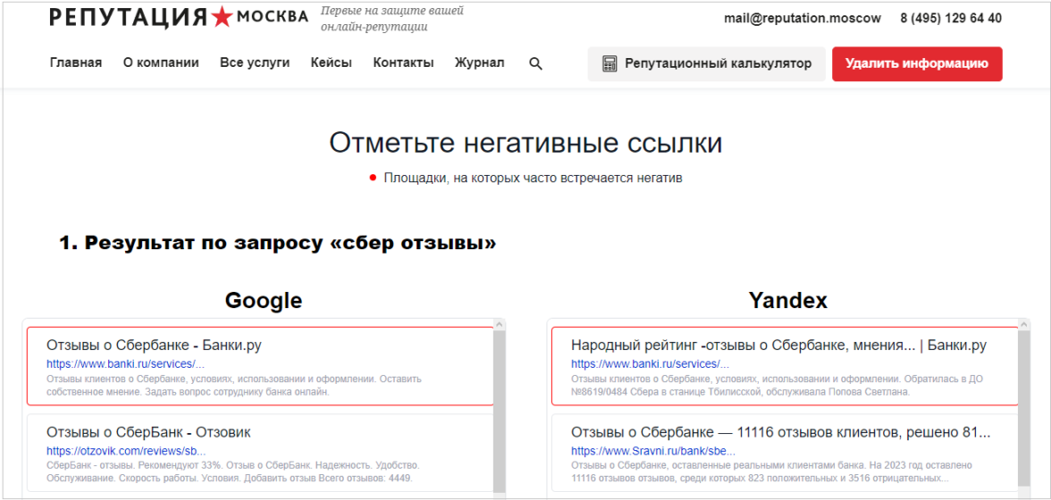 Приветствуем! Мы — агентство «Репутация Москва». На протяжении 11 лет мы удаляем из интернета плохие отзывы, негативные статьи и видеоролики.