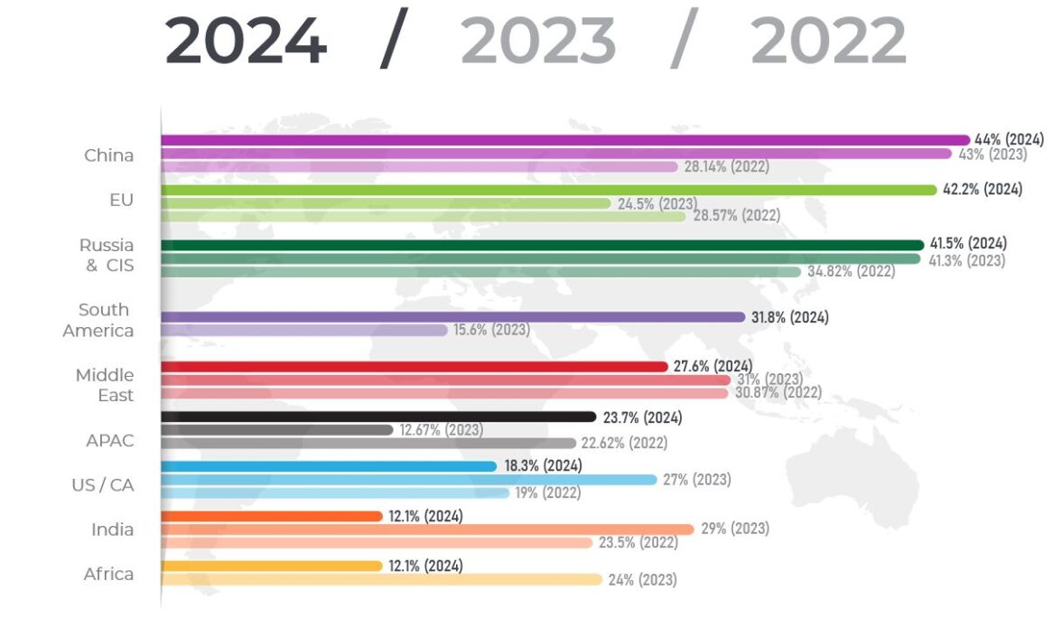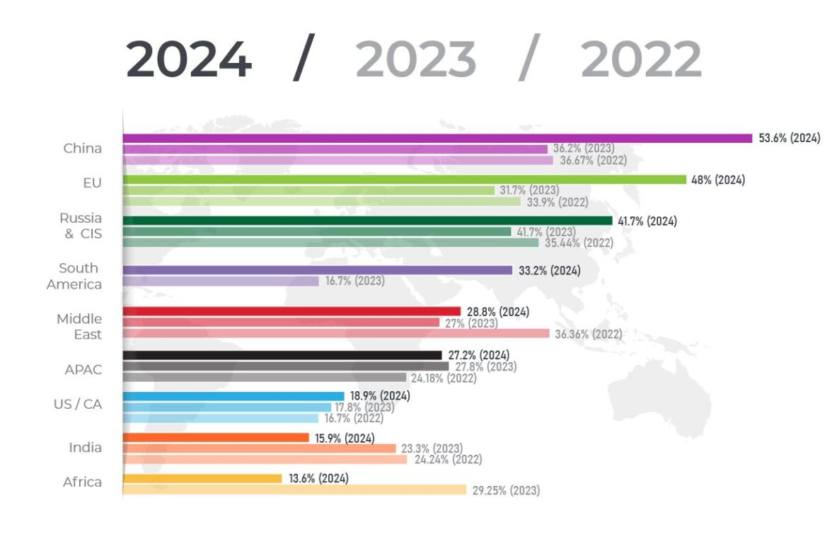 Самый высокий процент мошеннического трафика в 2024 году платформа Fraudscore зарегистрировала в Китае — 44%. Второе место с показателем 42,2% фрода в интернет-рекламе заняли страны Евросоюза. В пятерку также вошли Южная Америка (31,8%) и Ближний Восток (27,6%).