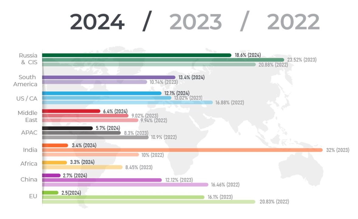 Регионы мира с наибольшей долей фрода в интернет-рекламе в 2022-2024 гг.