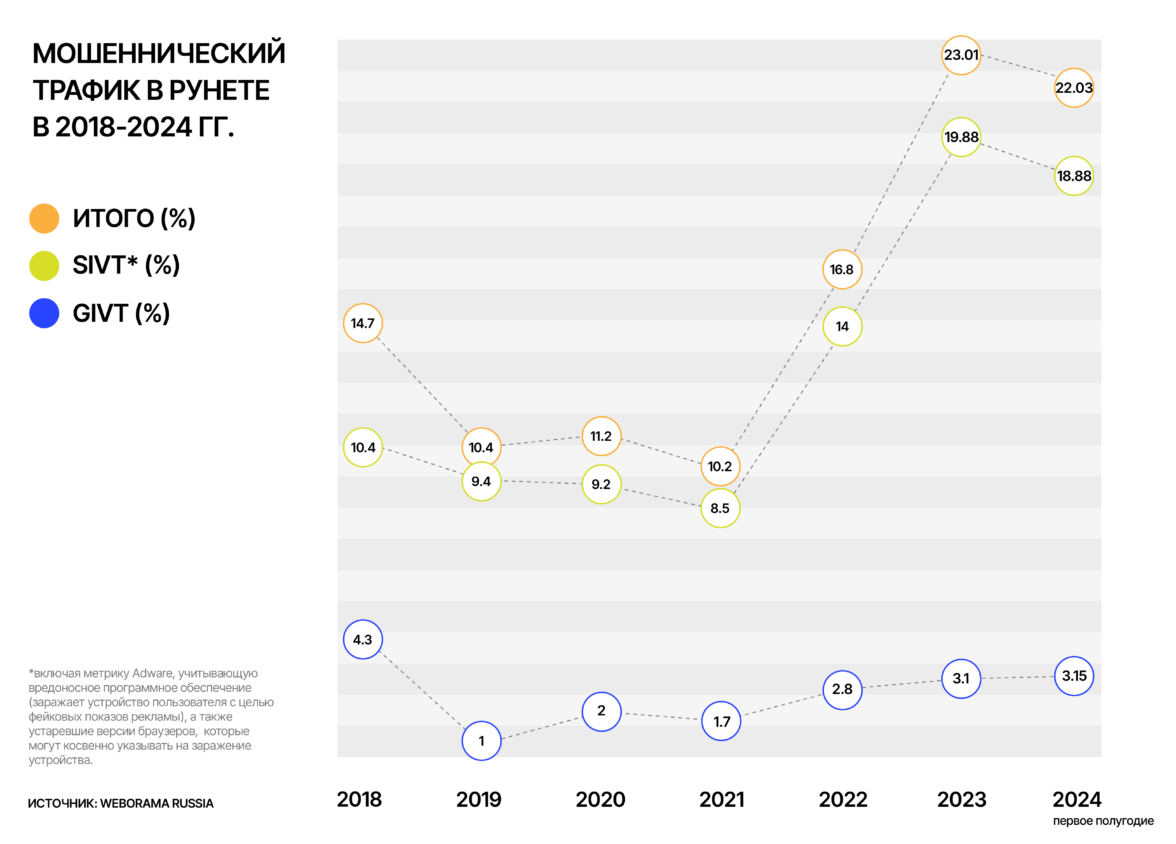 Авторы исследования в презентации не уточнили, какие категории мошеннического трафика включены в оценку по российскому рынку (GIVT, SIVT), а также какой вид трафика они учитывали — медийная реклама или реклама с оплатой за действие (CPA-модель).