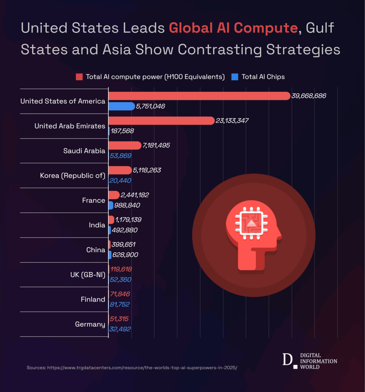 На втором и третьем местах — арабские страны: ОАЭ с 23,1 млн эквивалентов Nvidia H100 и Саудовская Аравия с 7,2 млн. Ближний Восток превратился в новый мощный центр искусственного интеллекта. В мае 2025 года в Эр-Рияде в рамках официального визита президента США Дональда Трампа было подписано соглашение между американскими технологическими компаниями и государственной компанией Humain из Саудовской Аравии. В рамках сделки Humain планирует построить два кампуса с 11 дата-центрами мощностью 200 МВт каждый с планами масштабирования до 1,9 ГВт к 2030 году и до 6 ГВт к 2034-у.