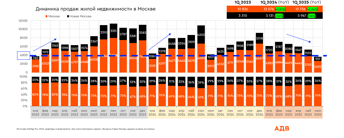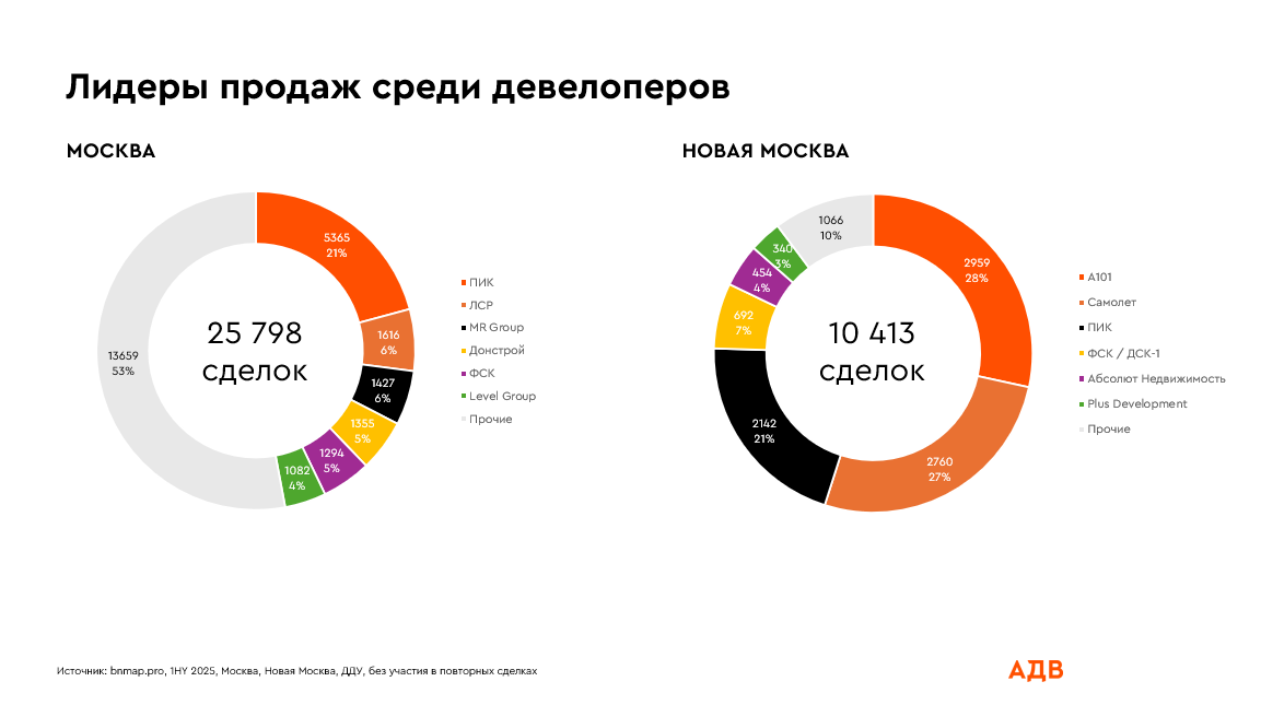 **Источник: bnMap.Pro, 2025, исследованы квартиры и апартаменты, ДДУ, продавец ЮЛ, без учета повторных сделок, Москва и Новая Москва.