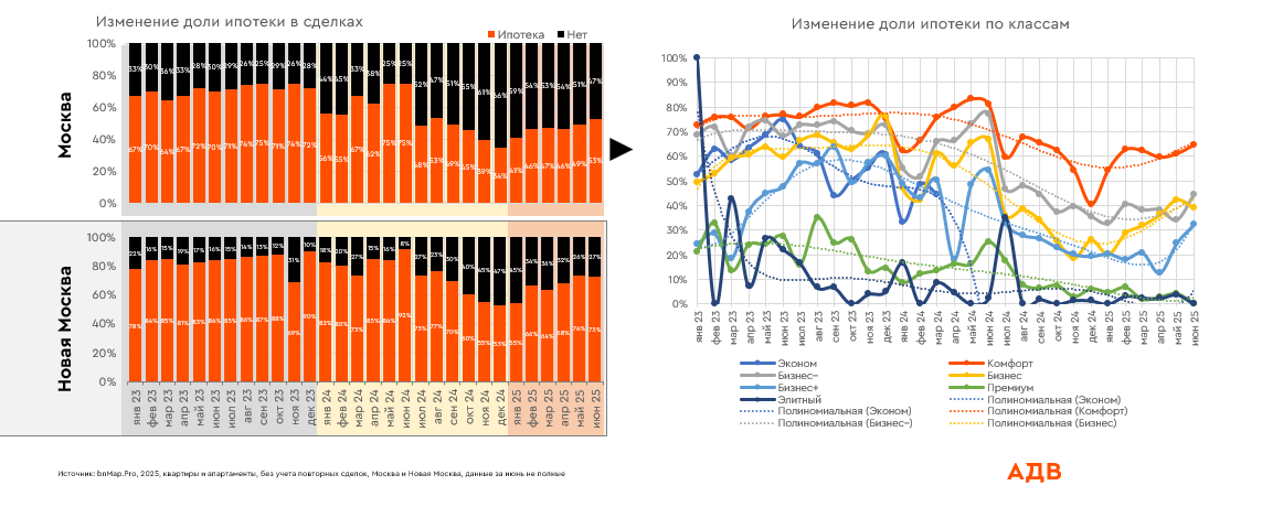 Доля ипотечных сделок продолжает расти во всех массовых сегментах. В Новой Москве, где преобладает комфорт-класс, этот показатель достиг 73%**. Однако новые ограничения ЦБ, введенные с 1 июля 2025 года, могут сократить количество кредитов с низким первоначальным взносом, что потенциально уменьшит долю ипотечных сделок, одновременно повысив их качество.