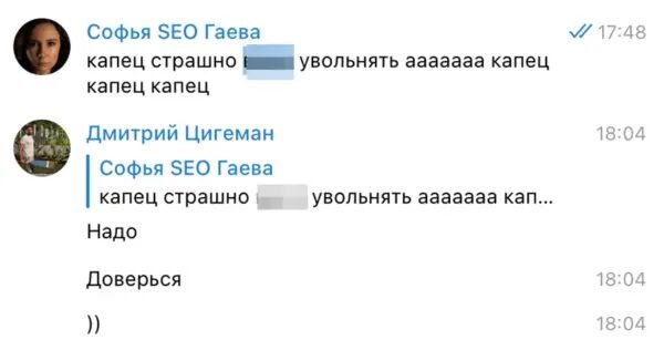 Почему я его не увольняла?⁃ Валера хороший человек⁃ Он много знает про маркетинг⁃ Он консультирует отдел продаж по техническим вопросам⁃ У него уникальные компетенции⁃ Мне было страшно. Вот скрин моего сообщения к бизнес-консультанту