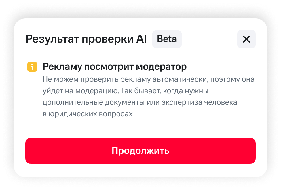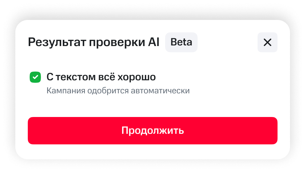 AI-модератор проверяет текст рекламного объявления на отсутствие обсценной лексики, соответствие законодательству, а также соблюдение норм орфографии и пунктуации. Если в объявлении нет ошибок, рекламная кампания будет одобрена и запущена автоматически — пользователю не нужно заходить в личный кабинет, чтобы вручную запустить рекламу. Если ошибки есть, AI-модератор подскажет, что исправить. После исправления ошибок объявление проверяется повторно. Спорные случаи направляются на ручную проверку специалисту МТС AdTech.